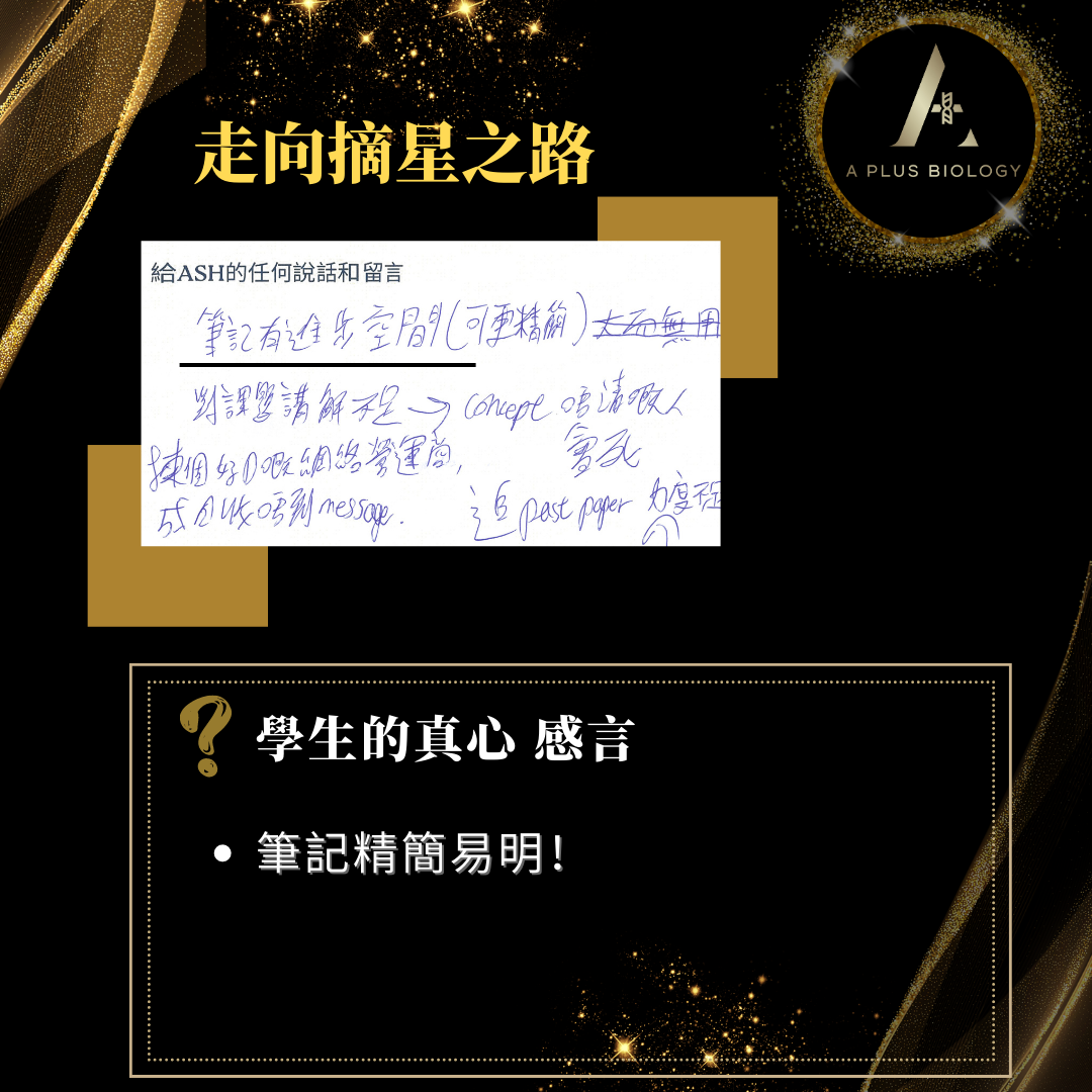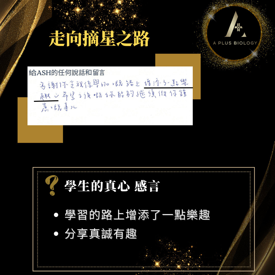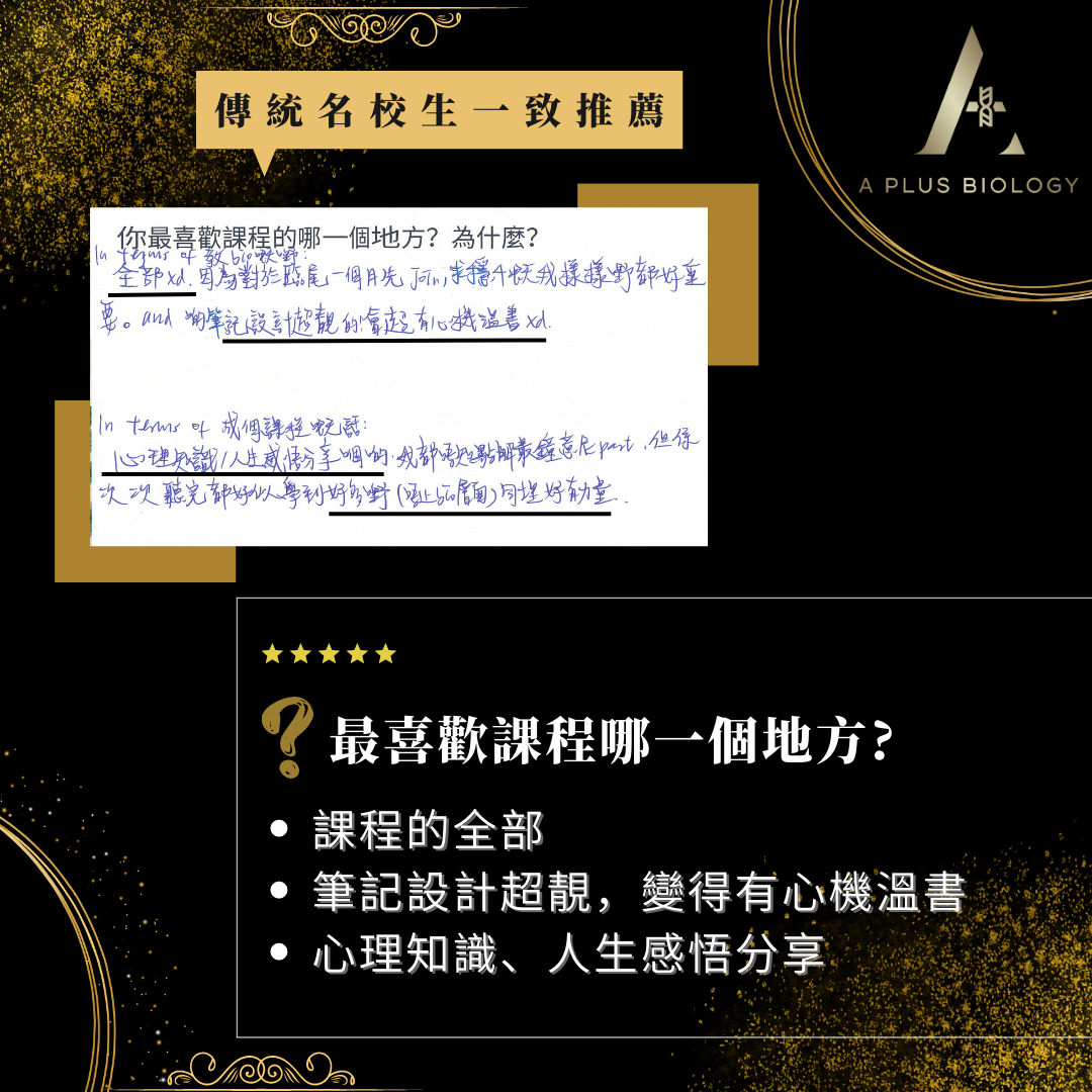 好多答題嘅技巧同框架,因為好多書本內容上面嘅嘢願意花多啲時間就會背到。但係相對考試嘅技巧答題方面係好需要人哋去教,而學校老師又好少去教導嘅嘢。 Ho Sir 令到我更加識得點樣玩尼一場遊戲。呢場遊戲,有咗入場券、有咗遊戲簡介、有晒裝備,而Ho Sir就好似嗰本遊戲攻略:教你點樣成功打怪,點樣upgrade。 自問自己本身好少補習,亦都唔太鍾意補習,真係為咗DSE希望可以Bio考更加好嘅成績所以就嘗試補。諗咗好耐到底要絲寶掙扎咗好耐到底要揀邊個補習社。 有好多出名嘅補習社,好似好有名氣,但係感覺太過大型又唔適合自己,一大班人又未必可以仔細咁照顧到。感恩最後選擇左嘅係A PLUS biology🤍 可能因為太多師兄姐講,補習係幾好攰或者好辛苦嘅事,但係Ho Sir既堂完全冇呢個問題! Ho Sir你每一堂都會好有精神去講唔同嘅內容,就算病咗,但係上堂嘅狀態依然唔會令人覺得好頹,有時仲會分享下自己一啲嘅經歷,小小嘅叉開話題好似俾我哋頭腦清醒啲,之後再繼續聽落去。有時覺得上Ho Sir堂唔單止學到skill,更加好似比自己打氣咁,有返啲力量同埋動力繼續去讀。 雖然跟咗Ho Sir三個月,話長唔長話短唔短,但係都仲係做緊網友🙈 不過依然好想講一句「辛苦晒」!多謝你願意去保持上堂嘅狀態,又會好積極咁樣邀請我哋答你問題,好似之間有互動咁樣,又唔會厭我地答到亂七八糟,或者唔識做! 希望完咗呢一兩個月你可以好好休息,之後再教更多更多嘅學生,令佢哋可以一齊對Bio充滿興趣!知道Bio有幾好玩👅 Thank you so much~ Ho Sir